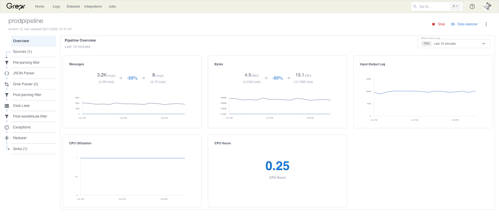 Reconfigure your log shippers to send data to the Grepr endpoint. The dashboard shows message throughput and volume reduction in real time.