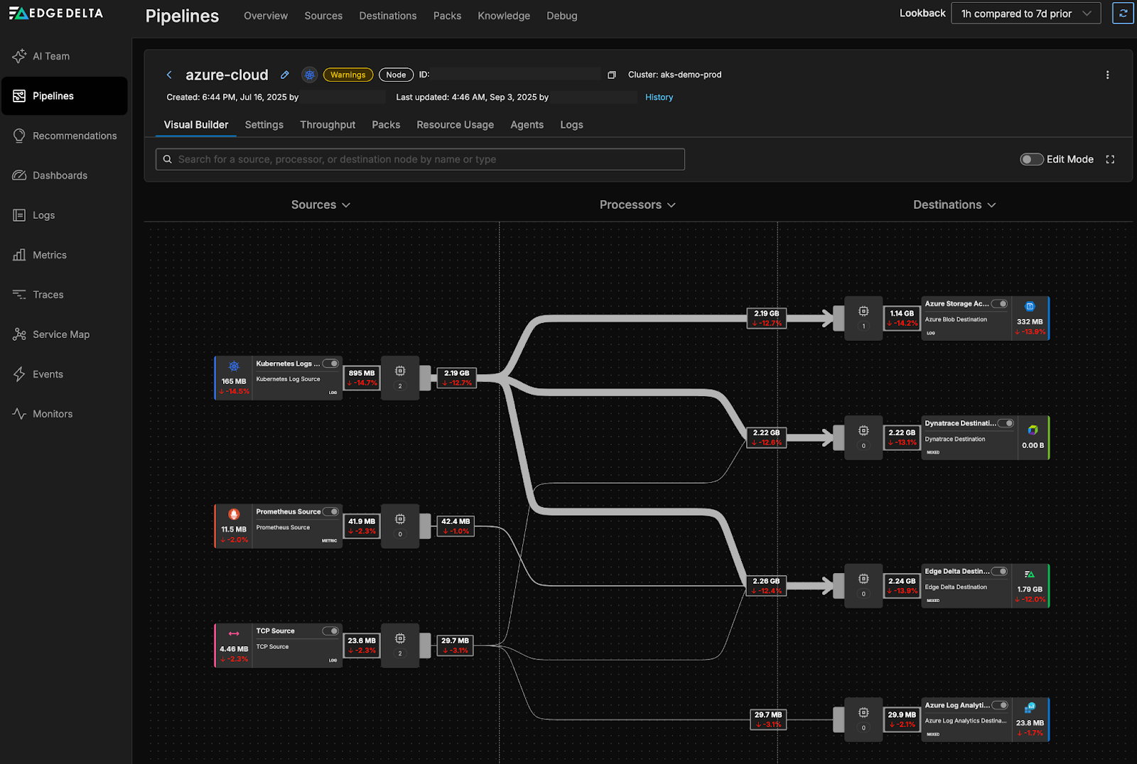 Edge Delta pipeline configuration is entirely manual. The sources, sinks, and numerous filters must be manually added and configured for each pipeline. A misconfiguration of a pipeline can result in a significant increase in observability data volume, along with additional egress charges.