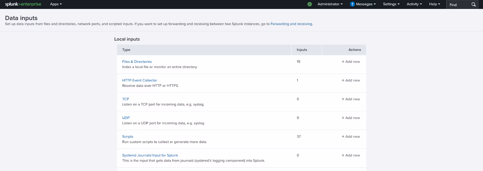 To start you need to set up a HEC data input and save its access token. On the Splunk web dashboard go to Settings -> Data Inputs.