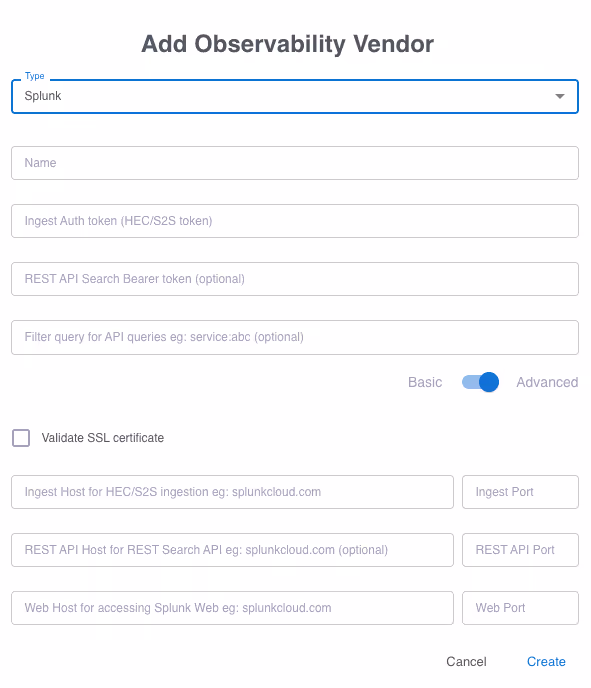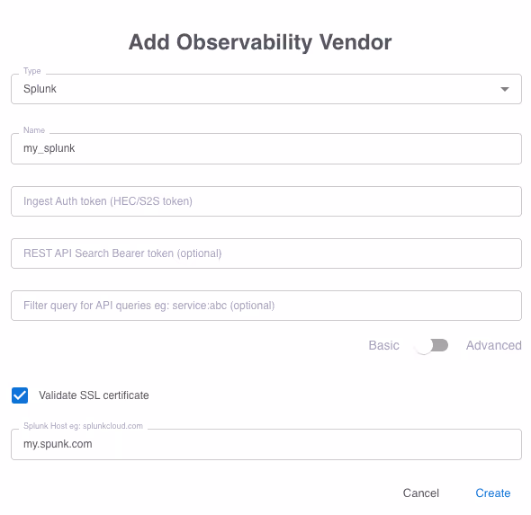 To work with Grepr your Splunk indexing server must have access tokens enabled. Grab a copy of the access token you want to use. On the Grepr dashboard select Integration from the top menu then click the “Add New” button under “Observability Vendors”. Click the toggle to “Advanced”.