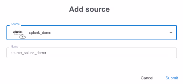 Select the observability vendor integration you created in the first step, the name is automatically filled in. When the form is submitted the source is added to the pipeline and a matching sink is automatically added. A pipeline can have multiple sources and sinks however, for this example we will keep it simple with just a single source and sink. The same sources and sinks can be used in multiple pipelines.